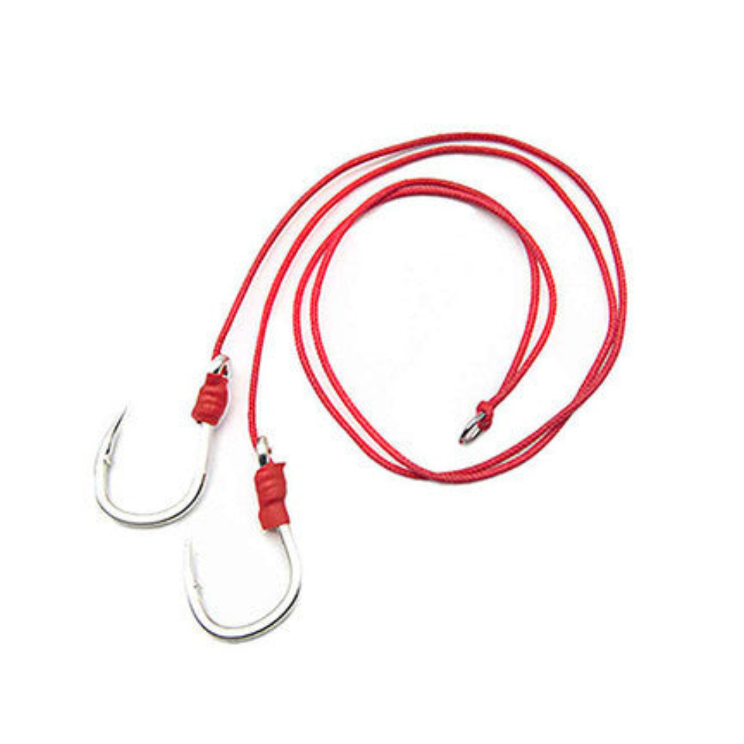 This assist rig is mounted on 1.2 mm red braid with a high-strength inner core and features two sharp carbon alloy hooks. It includes a stainless steel safety ring for secure attachment.