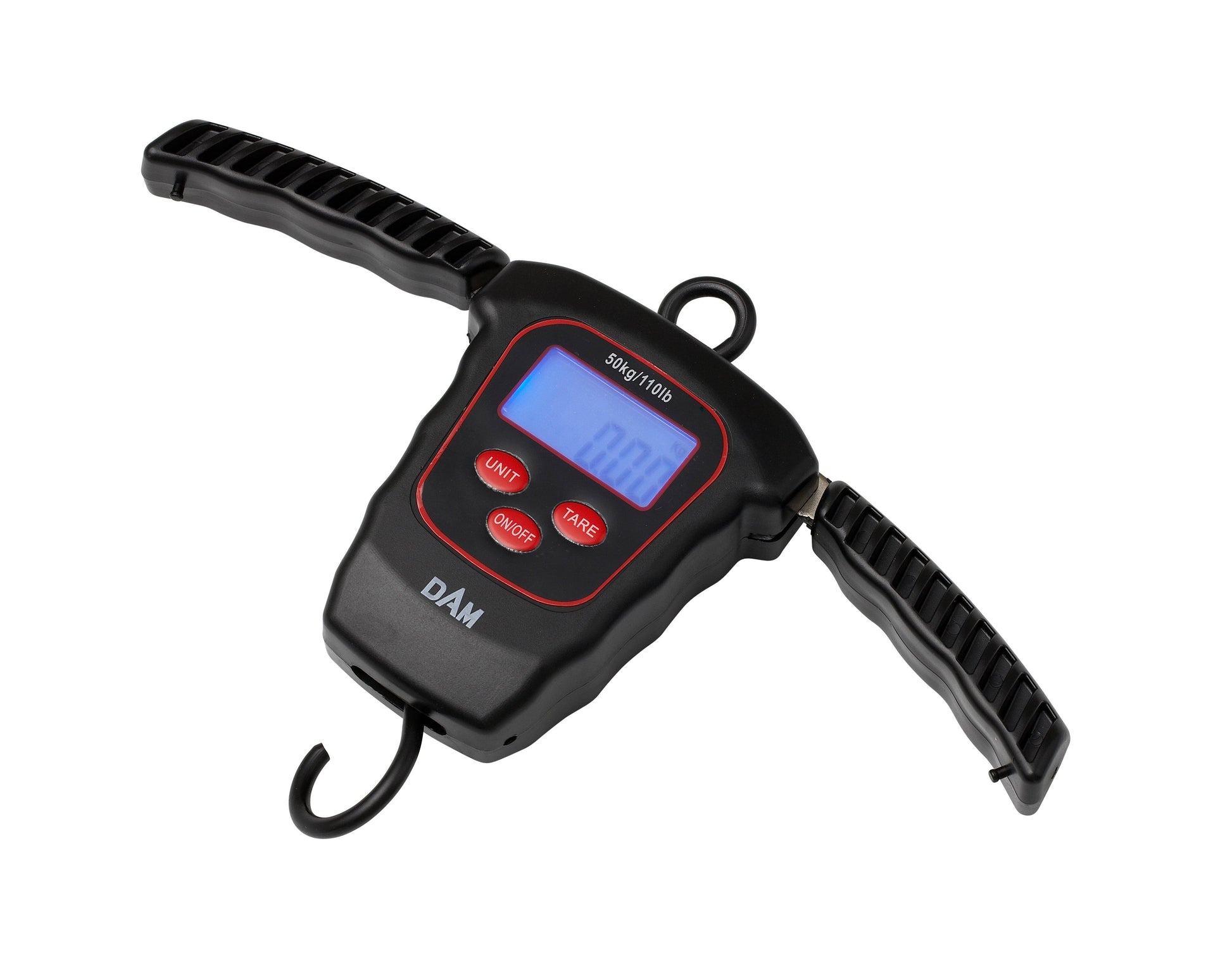 Bilancia digitale, con due manubri grandi, maneggevoli e pieghevoli - per pesare pesci di grandi dimensioni. L'ampio schermo LCD illuminato visualizza il peso in libbre o chili. Mostra anche un'indicazione della durata della batteria e memorizza il peso più pesante. La funzione tara consente di impostare il peso a zero con l'imbragatura già attaccata, per escluderne il peso. Richiede 2 batterie AAA da 1,5 V (non incluse). Una funzione di risparmio energetico spegnerà automaticamente la bilancia dopo 60 secondi, per prolungare la durata della batteria. Pesa il pesce fino a 50 kg/110 libbre. Precisione: 10 g.