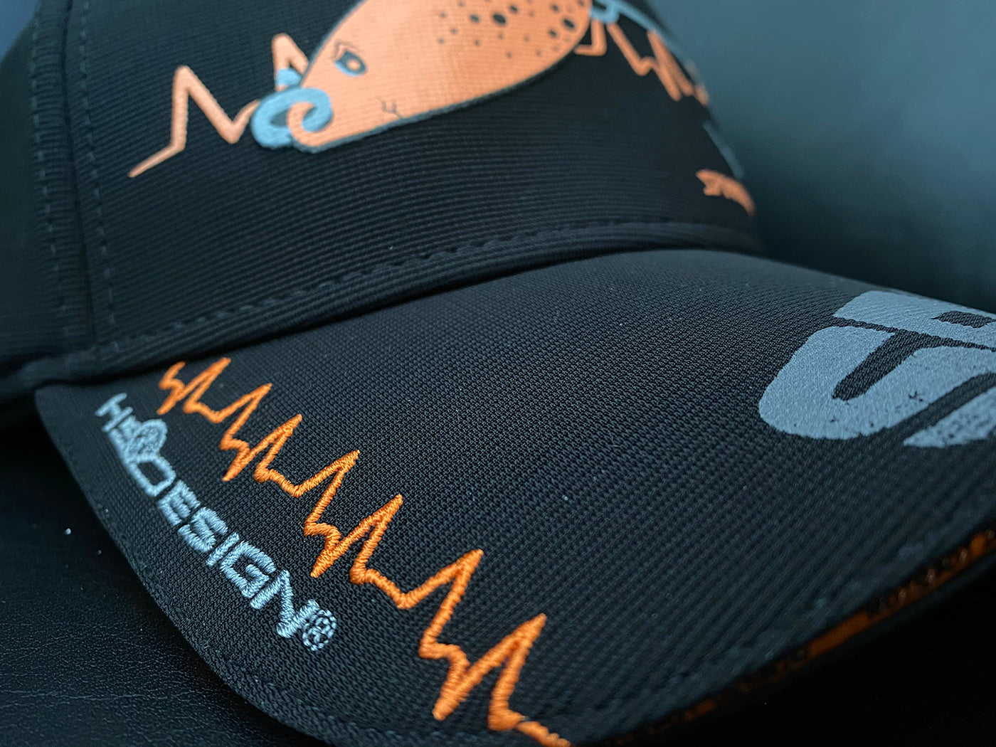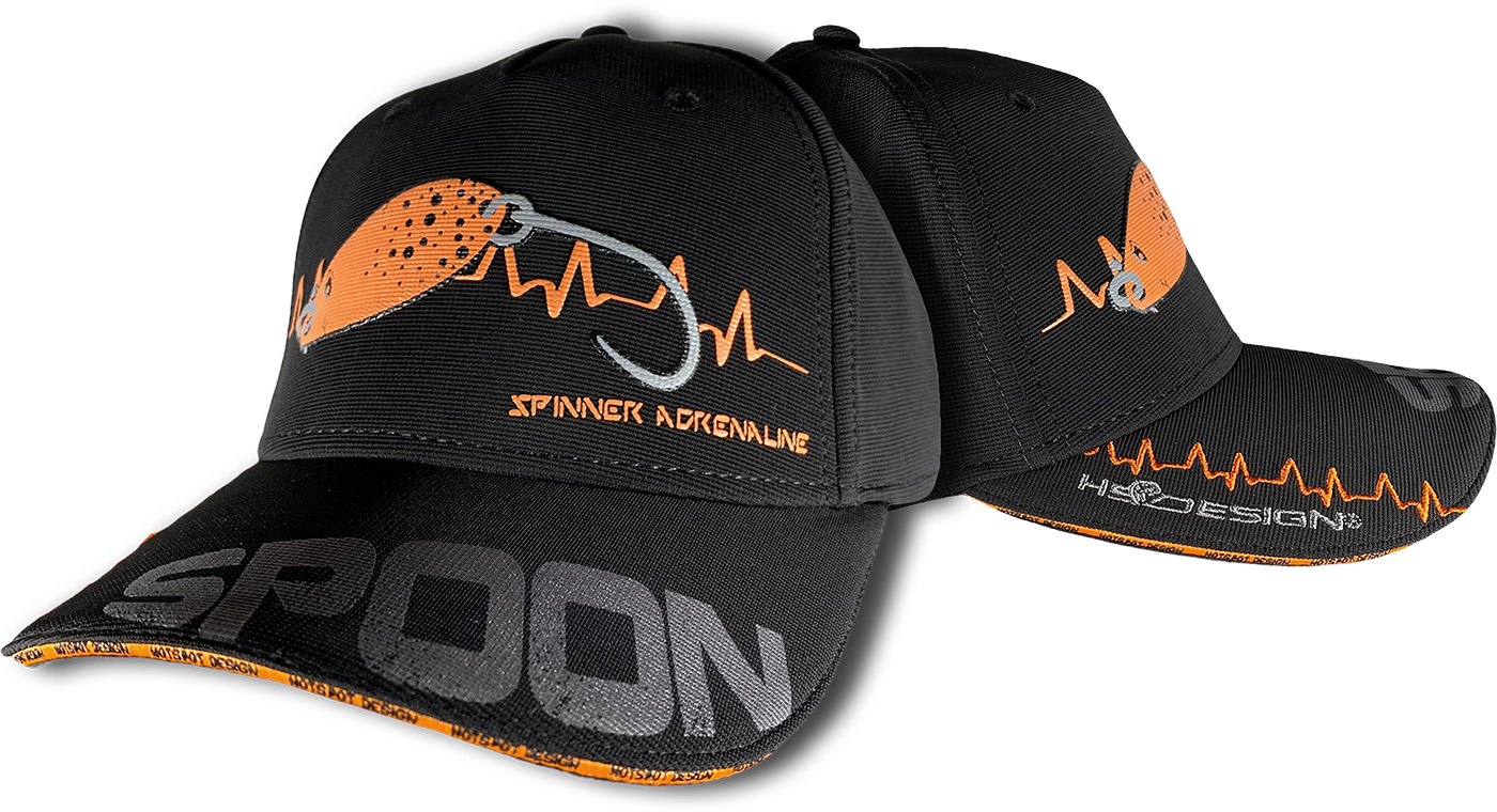 Devant du capuchon : Leurre cuillère avec impression en relief bien évidente avec lignes « adrénaline » brodées sur les deux côtés.
