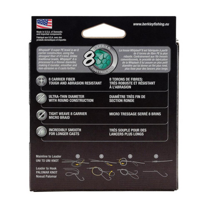 La Berkley® Whiplash® 8 est une ligne tressée à 8 brins, fabriquée à partir de fibres 100 % PE. Sa structure serrée en fait une ligne adaptée aux situations de pêche exigeantes, en eau douce comme en mer.