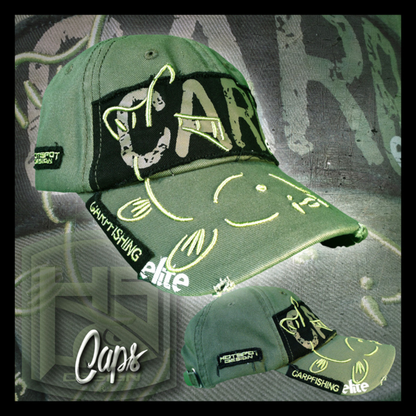 Передняя часть кепки: пришита черная нашивка с надписью «Карп», напечатанной зеленым цветом, и надписью «Элита», напечатанной более светлым зеленым цветом, текст «Рыбалка», вышитый на левой стороне нашивки. Рисунок карпа, вышитый в 3d, который начинается над нашивкой и доходит до козырька.